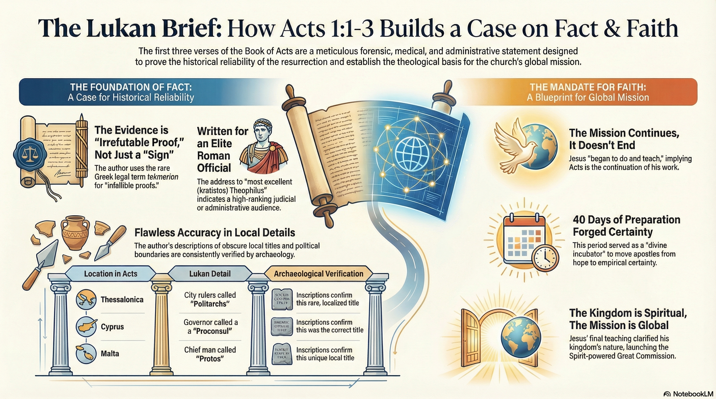 In the first century, tekmerion was the "gold standard" of evidence used by doctors for diagnosis and lawyers to win trials. By using this term, Luke signals that the Resurrection was a physical, historical fact—seen, touched, and verified. Writing while eyewitnesses were still alive, Luke’s account remained unrefuted in a land where many knew the participants. Addressing his report to the high-ranking Roman official Theophilus, Luke maintained meticulous accuracy. From archaeological details to precise municipal titles, Luke proves himself a reliable investigator, providing an "orderly account" (v. 3) you can trust.