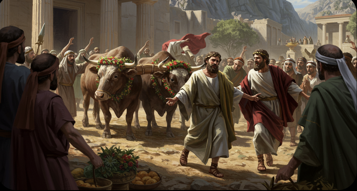 Crowd erupts in local dialect: When the crowd saw what Paul had done, they shouted in the Lycaonian language, 'The gods have come down to us in human form!' Barnabas they called Zeus, and Paul they called Hermes because he was the chief speaker. The priest of Zeus, whose temple was just outside the city, brought bulls and wreaths to the city gates because he and the crowd wanted to offer sacrifices to them (verses 11-13). Misplaced worship surges—Zeus and Hermes, local deities, fitting Barnabas's stature and Paul's eloquence.