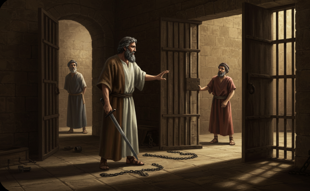In Philippi's prison, beaten and stocked, Paul and Silas pray and sing hymns at midnight, fellow prisoners listening. Suddenly, an earthquake shakes foundations, doors fly open, bonds loosen. The jailer, fearing escape, draws his sword for suicide, but Paul shouts, Don't harm yourself! We are all here! Trembling, he asks, Sirs, what must I do to be saved? They reply, Believe in the Lord Jesus, and you will be saved—you and your household (Acts 16:25-40). He tends wounds, hears the word, baptizes with family. Morning, magistrates send release, but Paul demands public escort as Romans. Freed, they encourage believers, depart. This turns peril to proclamation, advancing The Great Commission through supernatural rescue and conversion. Relate it: In dark times? Praise like them; watch God open doors. Act today—sing in your 'prison'; share salvation with one in need.