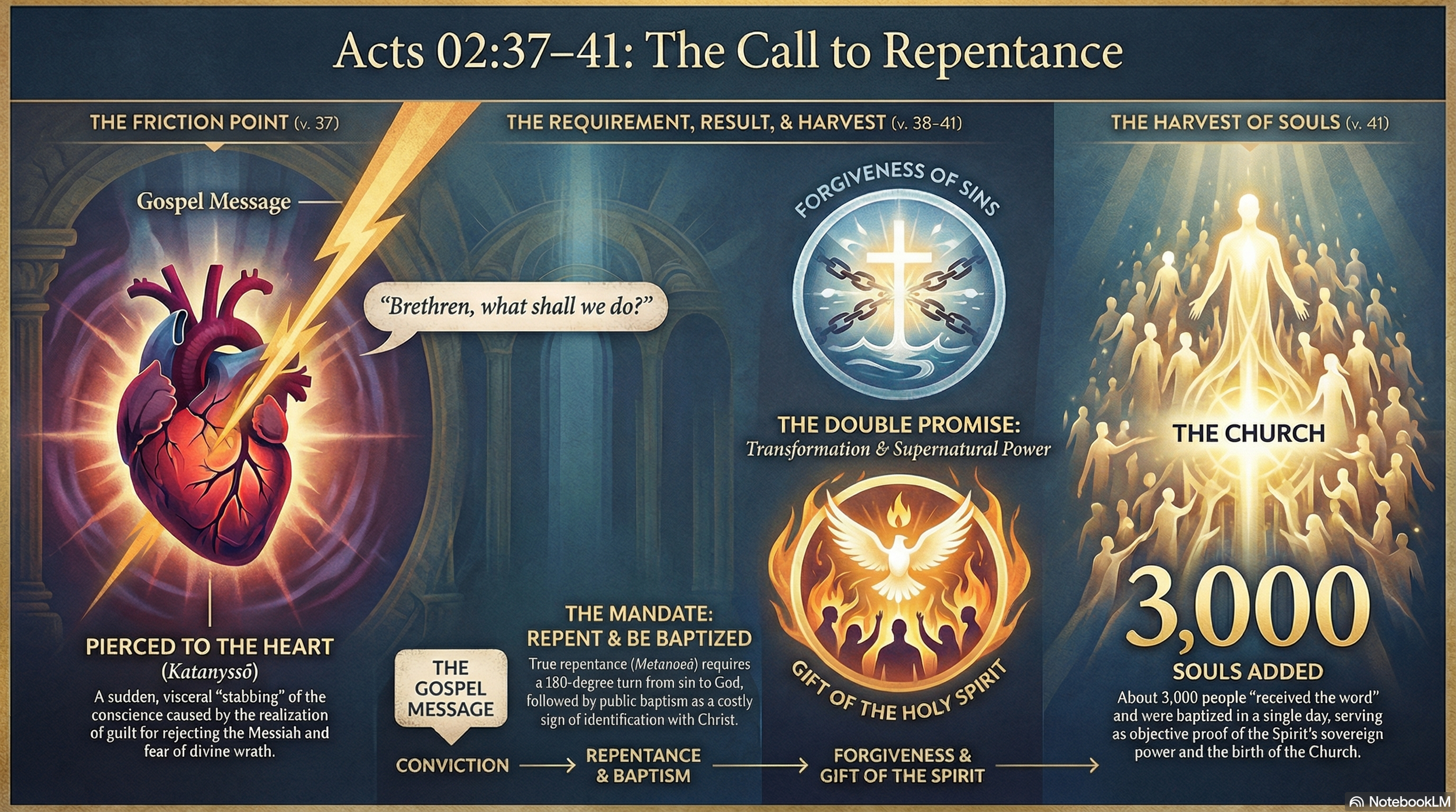 The forensic record of Pentecost concludes with the audience’s realization of their own guilt in the execution of the Messiah. Being "pricked in their heart" (v. 37), the crowd moved from mockery to a desperate inquiry for a solution. Peter’s response established the "Apostolic Blueprint" for conversion: a turn from the "untoward generation" and a public identification with Jesus Christ through baptism. The evidence was so compelling that three thousand individuals accepted the Forensic Verdict, immediately transitioning from enemies of the Cross to the foundational members of the Spirit-filled community.