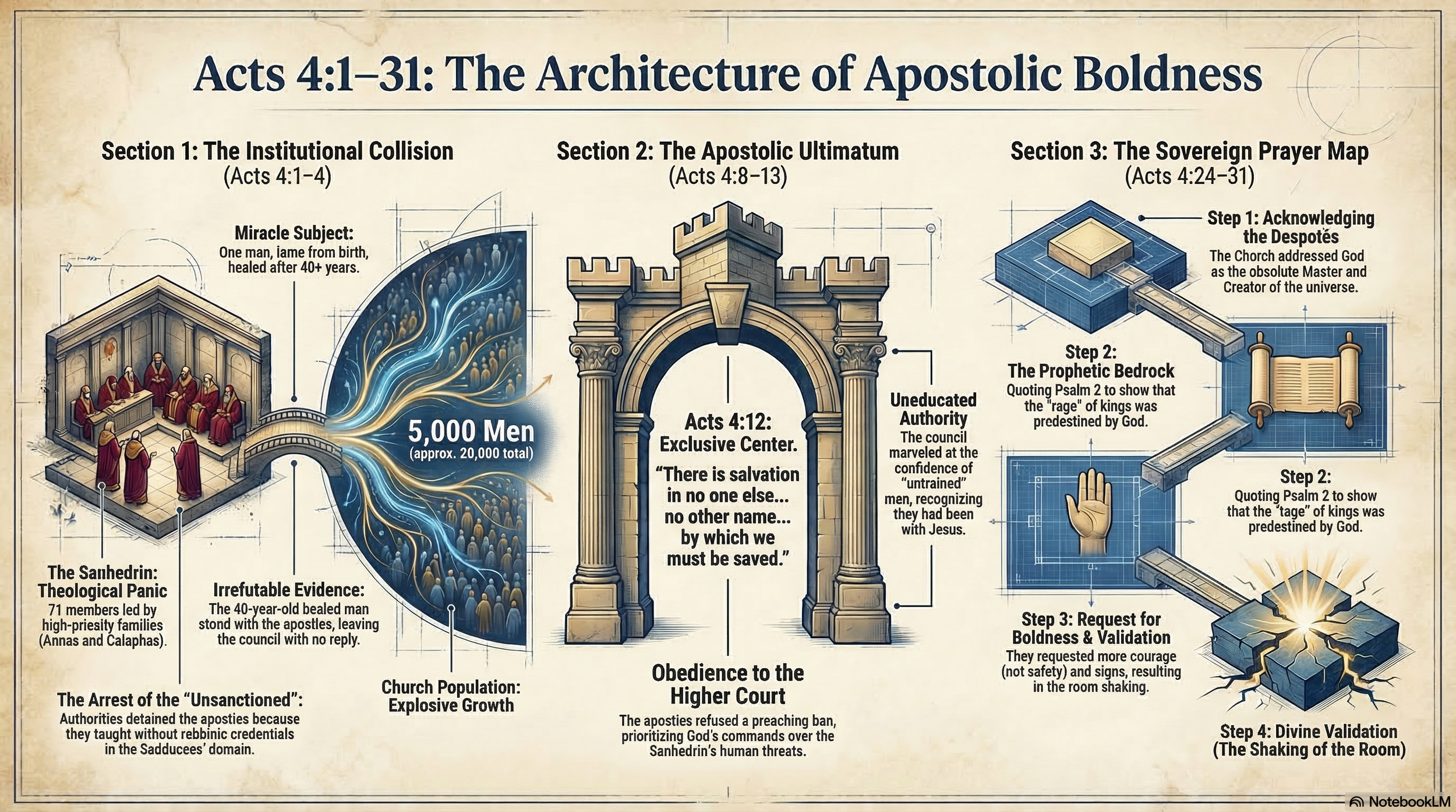 The Theology of Prayer: The prayer in verses 24-30 is a masterclass in sovereignty. The Apostles did not ask God to stop the persecution; they asked for the enablement to fulfill their mission through the persecution, recognizing that their enemies were only doing what God's hand and counsel had “determined before to be done. (Acts 4:28).