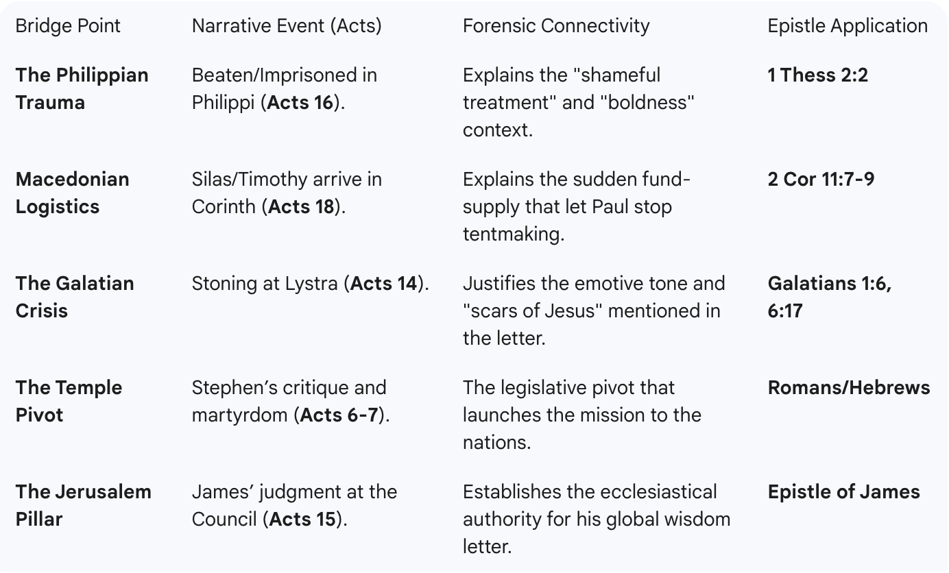 Instructions for the AI: 1. Identify the Bridge Point: Locate the specific historical event in Acts. 2. Cross-Reference the Epistle: Find the incidental overlap or 'Undesigned Coincidence' in the New Testament letters. 3. Verify the Fixed Point: Cite the archaeological or historical data (e.g., inscriptions, Roman law) that anchors this connection. 4. Forensic Conclusion: Explain why this connection proves the New Testament is a unified, historically accurate information system."